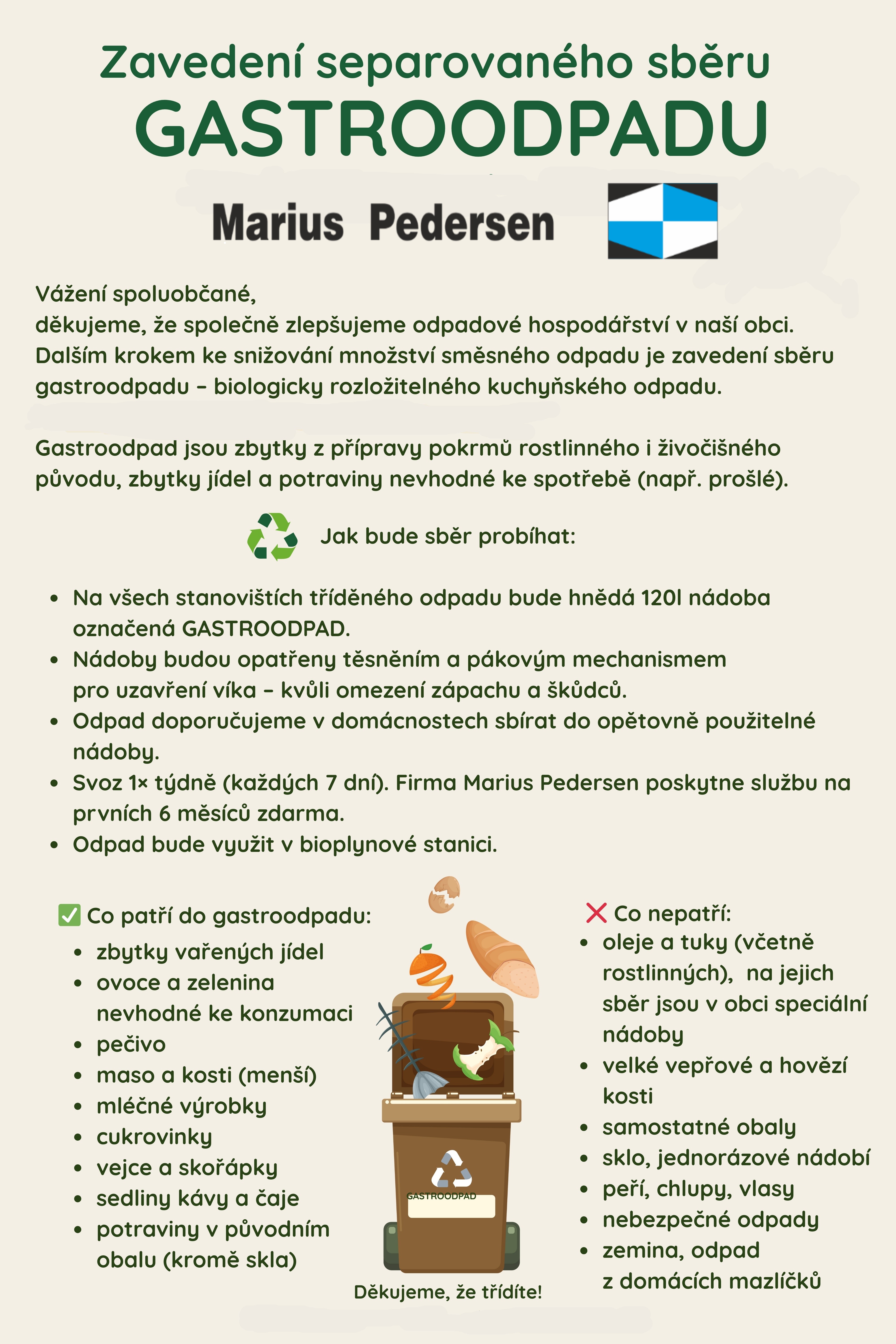 V dubnu t. r. bude uskutečněn další krok ke snižování množství směsného odpadu = zavedení sběru gastroodpadu – biologicky rozložitelného kuchyňského odpadu. Gastroodpad jsou zbytky z přípravy pokrmů rostlinného i živočišného původu, zbytky jídel a potraviny nevhodné ke spotřebě (např. prošlé).